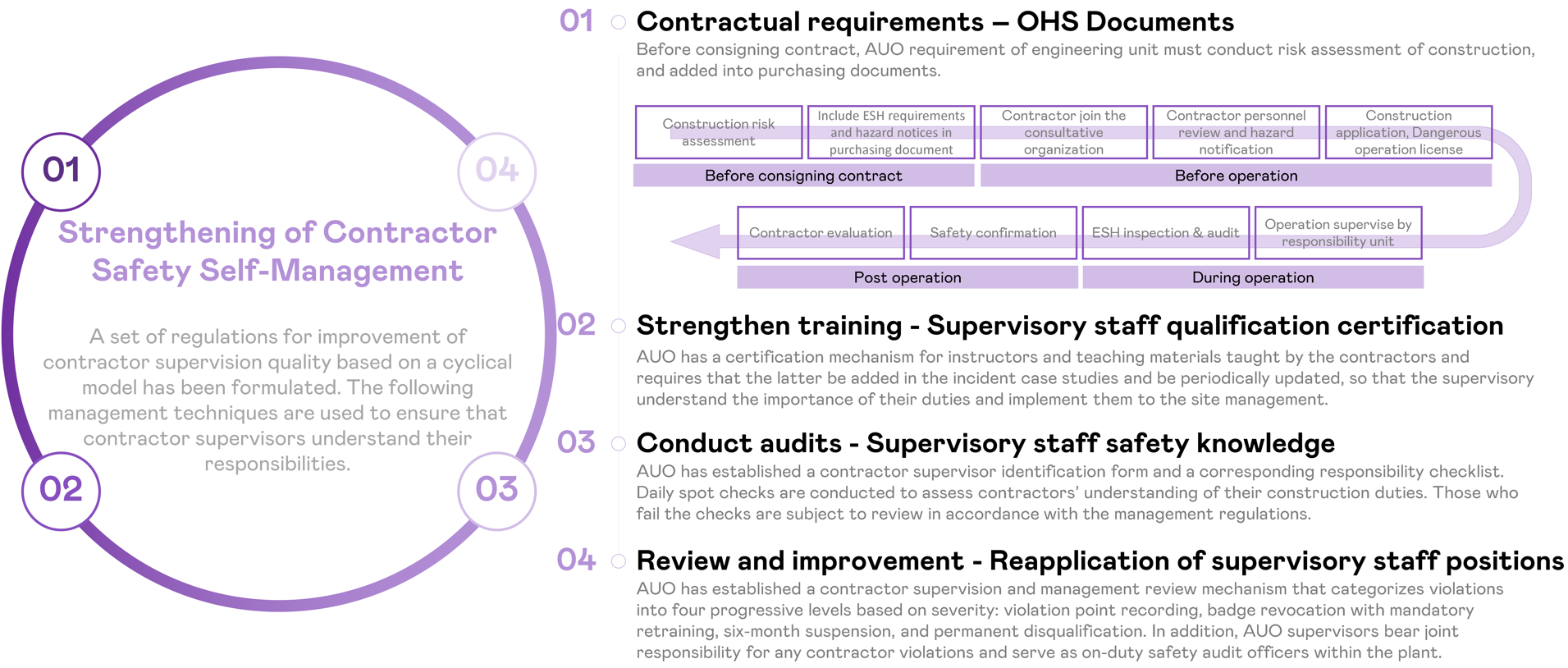 An e-Contractor management system platform has been established by AUO to expand contractor participation in the coordination organization. The initiatives are aimed at improving safety self-management at work sites.
